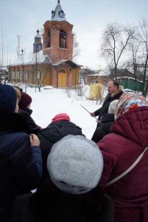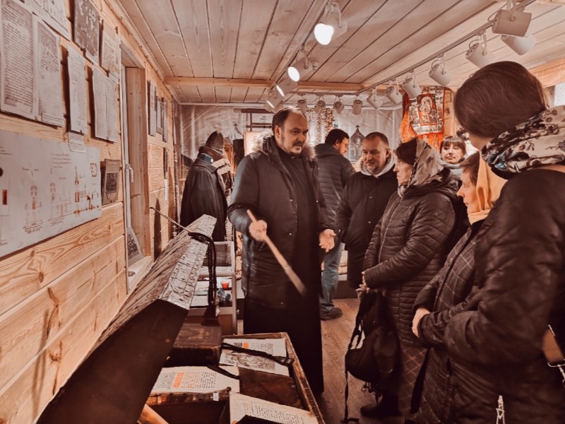 Далее экскурсия переместилась в храм общины – церковь Рождества Пресвятой Богородицы, уникальный памятник истории и культуры кон. XIX – нач.XX вв., полностью отреставрированный в 2017 году, изюминкой которого является неповторимый деревянный резной иконостас выполненный в неорусском стиле и выкрашенный темперными красками имитирующими майолику. В храме гости с интересом узнали, что такое лестовка и подручник, а также познакомились с их практическим и богословским смыслом.