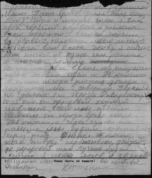 Однако среди сухих сводок и цифр иногда встречаются и особо ценные для музейщиков документы. Так, просматривая Книгу памяти, мы обнаружили незнакомую фамилию воина из Лыткарино – Картышева Сергея Никифоровича. Его не было ни в списке на лыткаринском мемориале «Звезда израненная», ни в списках ЛЗОСа, ни в архиве Лыткаринского музея. В ОБД «Мемориал» эта фамилия была внесена. И сколько же интересного мы узнали об этом человеке. Оказывается, перед войной он жил в Петровском, в большой и дружной семье. Когда началась война, ему было всего 16 лет. На фронт таких мальчишек в 1941 году не брали. А уже зимой 1943 года в возрасте 18-и лет он был призван Ухтомским райвоенкоматом на фронт. За два года молодой красноармеец прошагал сотни километров фронтовых дорог, прогоняя врага с родной земли. И до Победы оставалось совсем немного. Мать получила 30 марта 1945 года письмо от своего сына. Хотим привести полностью его текст (пунктуация изменена): «Здравствуйте дорогие родители мама, папа, брат Филя, Толя, сестры Катя, Нюра и Маруся. Шлю я вам свой горячий привет и желаю всего хорошего в вашей жизни. Во первых строках моего письма сообщаю вам, что живу я сейчас пока ничего, но хуже, чем раньше. Я поясню потому: сейчас мы все время под открытым небом живем. Идем по 30 километров в сутки. Погода плохая, дожди. Находимся мы в северной Украине недалеко от города Днепропетровск, 10-15 км от передовой. Кормят неважно. Всего мы прошли пешком от города Орла около 700 километров, через сутки или раньше мы будем переправляться через реку Днепр. Но ничего как-нибудь переживем, дойдем до передовой, там лучше будет. Сейчас я пока жив и здоров. Сообщайте как вы живете? До свидания. Картышев».