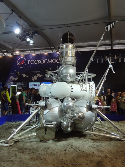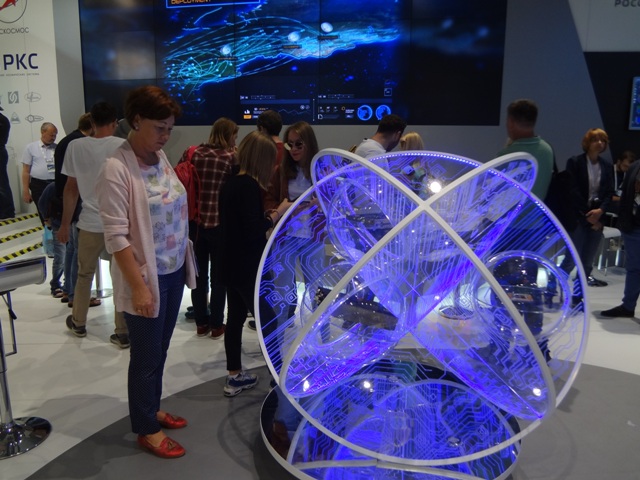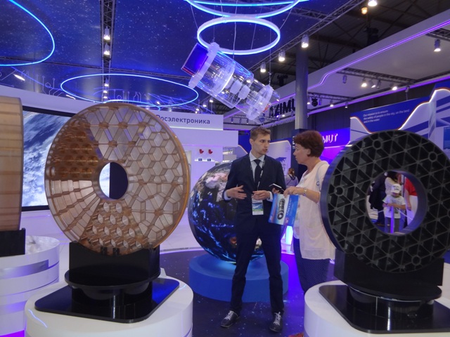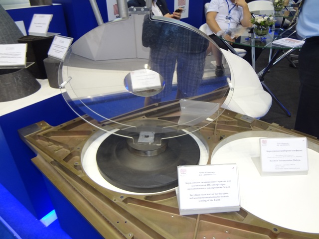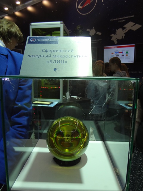 В павильоне РОСКОСМОСа на стенде ОАО «Композит» из г.Королёва нас заинтересовали космические зеркала из бериллия. Эти легкие зеркала космических телескопов при длительной эксплуатации в космосе обеспечивают большую размерную стабильность. Имея диаметр 1000 мм и толщину 130 мм, зеркало весит не более 40 кг. На стенде НПК «Системы прецизионного приборостроения» мы к своей радости опять вспомнили о Лыткарино. Здесь был представлен первый в мире сферический стеклянный космический аппарат «Блиц», запущенный в космос в 2007 году. Стеклянная часть спутника была изготовлена на АО ЛЗОС. Спутник был предназначен для калибровки и улучшения тактико-технических характеристик системы ГЛОНАСС. К сожалению, после столкновения с космическим мусором в 2012 году спутник был утерян. Аналогов ему в настоящее время нет, однако в 2018 году намечен запуск второго спутника, стеклянная часть которого также будет изготовлена на АО ЛЗОС. По своим размерам он будет немного крупнее своего предшественника.