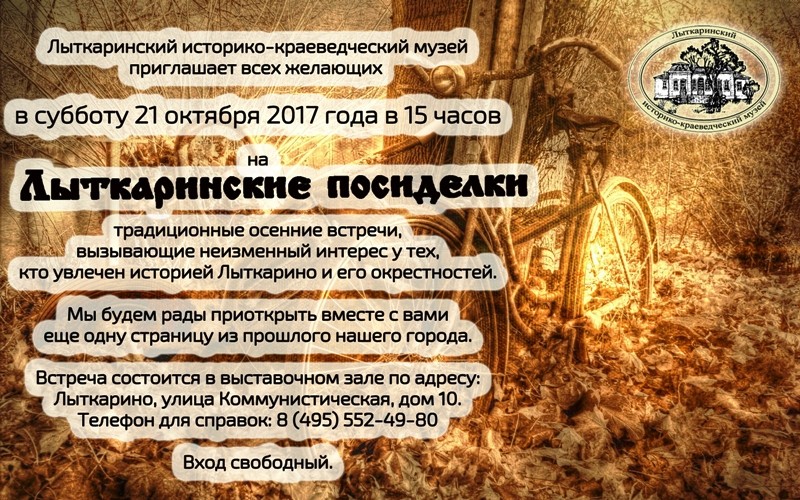 Лыткаринский историко-краеведческий музей приглашает земляков-лыткаринцев на очередную встречу в субботу 21 октября в 15 часов.