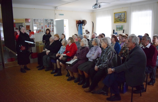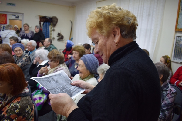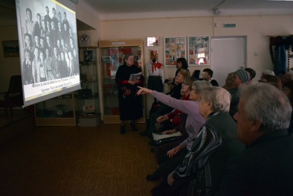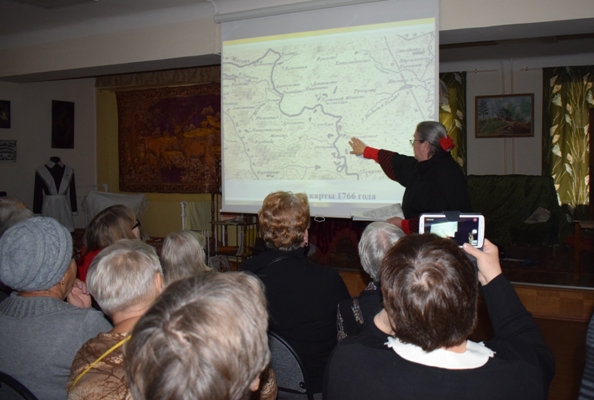 Хранитель фондов музея Пахомова Л.М. познакомила  участников встречи с историей этих мест. На основе собранных архивных документов, старых карт и фотографий сотрудникам музея удалось создать и продемонстрировать гостям  мультимедийную  программу «Усадки».