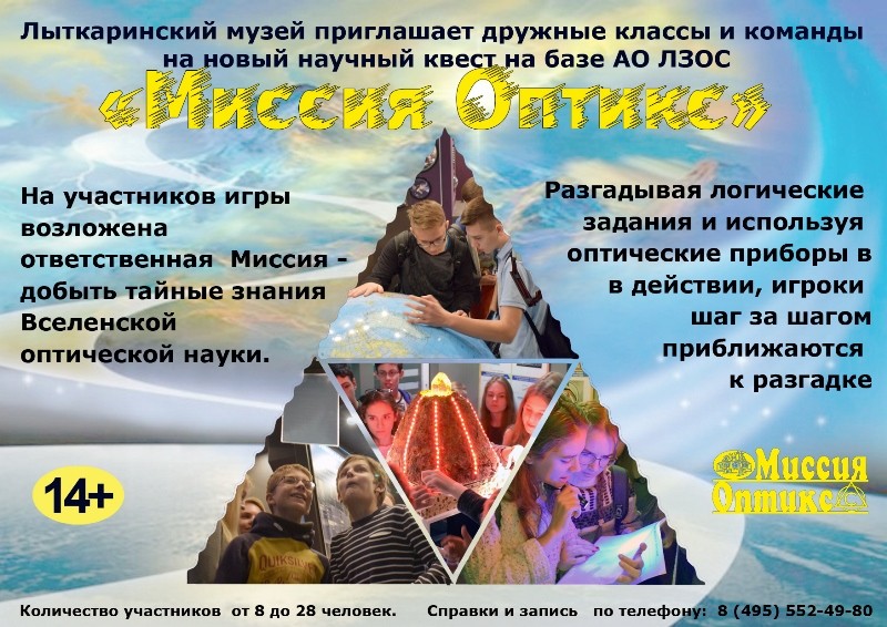 Уважаемые родители! Приближаются дни весенних каникул, когда ваши дети могут ненадолго отложить учебники в сторону, забыть о делах и заботах, наконец выспаться, погулять с друзьями, сходить в кино. Лыткаринский музей предлагает Вам организовать для своих детей увлекательное и познавательное приключение. Приходите на квест «Миссия Оптикс», который проводится на базе АО ЛЗОС для подростков с 14 лет (можно и с 12, если очень хочется) . Его необычный фантастический сюжет связан с астрономией, оптикой и Лыткаринским заводом оптического стекла. Ребята не только весело проведут свое время, но и получат новые знания. Для этого необходимо собрать группу от 8 человек и за несколько дней до желаемой даты позвонить в Лыткаринский музей по телефону: 8(495)552-49-80, чтобы мы успели подготовить для вас все необходимое.