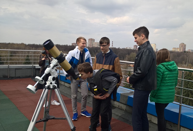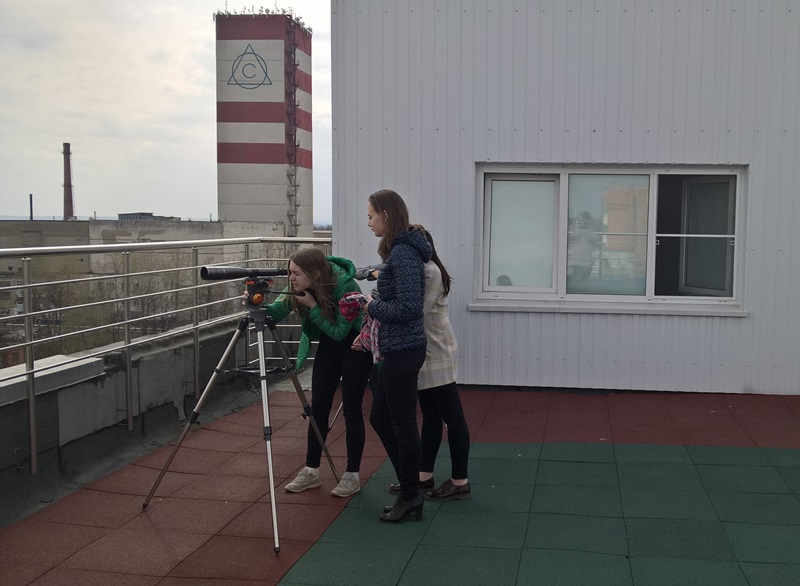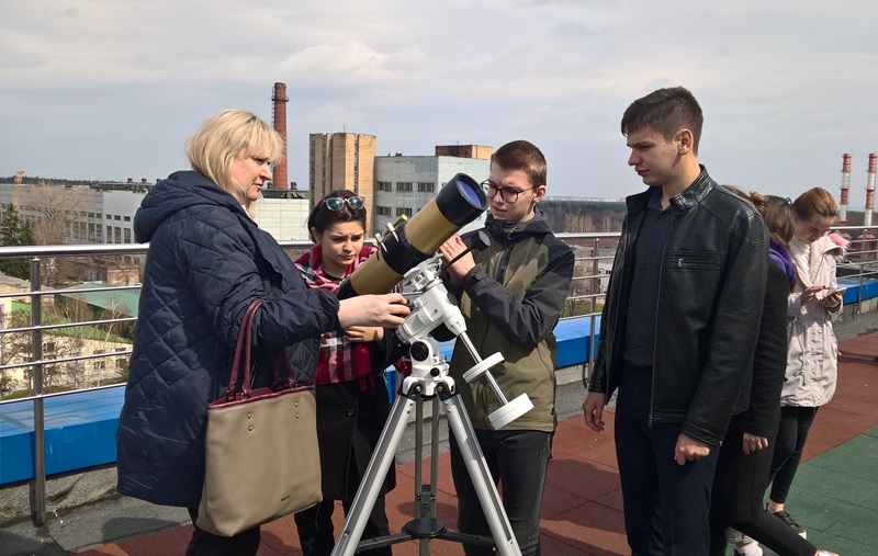 Эти ребята, к сожалению, в процессе обучения были лишены возможности изучать астрономию как предмет (напомним, что «Астрономия» начала постепенно вводиться в учебную программу с этого года). Поэтому информация, полученная в ходе экскурсии, в большей части была для них новой. Школьники узнали, где и почему лучше всего размещать обсерватории, какие условия нужно соблюдать при астрономических наблюдениях, как меняется вид звездного неба в течение одной ночи и всего года и другие интересные факты. Много полезной информации можно узнать из экскурсии, но самое интересное — все-таки взглянуть собственными глазами в телескоп. Погода не всегда позволяет, но ребятам повезло! Пока проходила теоретическая часть, хмурое небо посветлело и выглянуло Солнце. На смотровую площадку обсерватории быстро вынесли и настроили солнечный телескоп. Школьники провели наблюдения дневного светила, а в подзорные трубы рассмотрели окрестности. Ребята приобрели опыт работы с оптическими инструментами, самостоятельно освоив некоторые правила их подготовки к работе.