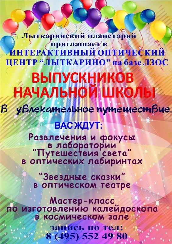 Уважаемые родители! Подходит к концу учебный год. Наверняка многие из Вас уже думают, как организовать детям интересный и запоминающийся праздник! Планетарий Лыткаринского музея предлагает увлекательную программу в Интерактивном оптическом центре «Лыткарино» с детской обсерваторией на базе АО «ЛЗОС». Дети погрузятся в фантастический мир  оптических лабиринтов и парадоксов, побывают в настоящей обсерватории, встретятся с мифическими персонажами в мире теней оптического театра. Каждый ребенок своими руками сделает для себя удивительный подарок «Волшебный калейдоскоп», который будет напоминать ему о случившихся с ним приключениях. Продолжительность программы 2 часа. По Вашему желанию праздник можно продолжить в столовой АО ЛЗОС, где для детей организуют чаепитие с ароматными пирожками или пиццей. Просьба бронировать даты заранее.