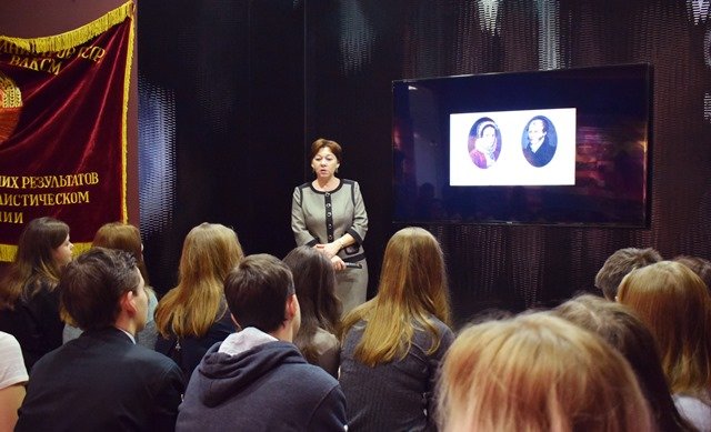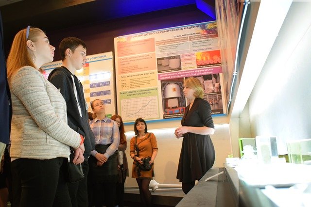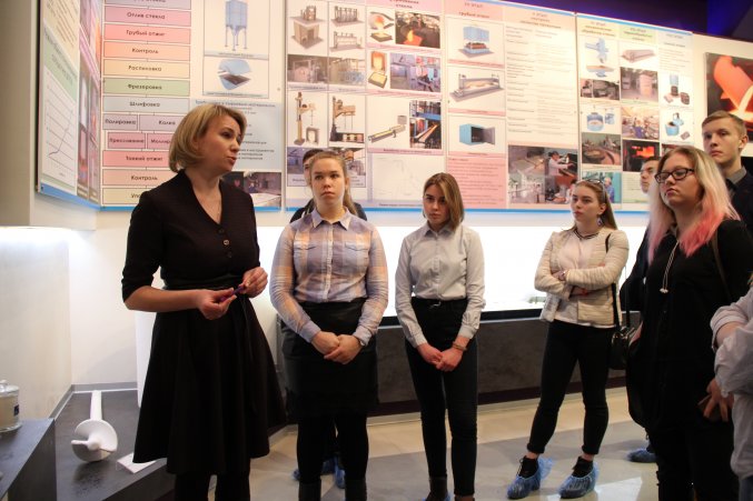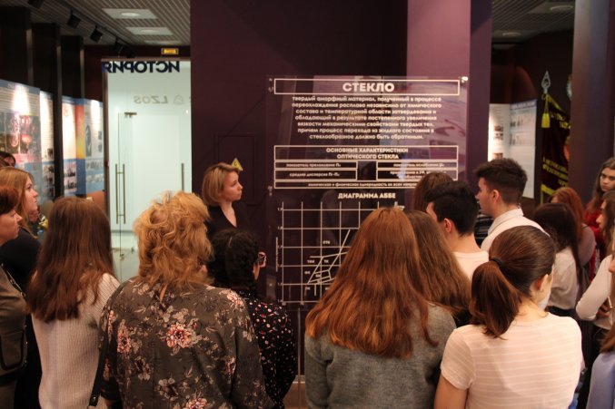Затем для учащихся инженер-технолог НПК-74 АО ЛЗОС Юлия Фирсова провела в выставочном зале продукции АО ЛЗОС занятие «Химические составы стекол и влияние химических элементов на свойства оптического стекла». Она рассказала о свойствах стекла и его отличиях от других веществ, сделала экскурс в историю открытия оптического стекла и первых технологиях его получения, продемонстрировала образцы с различными свойствами и рассказала о сферах его применения .
