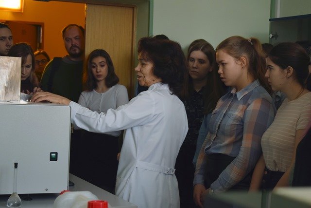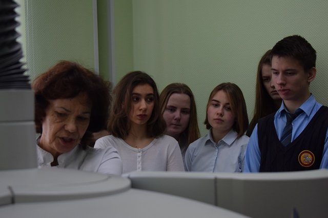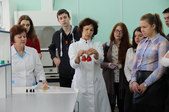 В центральной заводской лаборатории АО ЛЗОС школьники посетили спектрохимическую лабораторию, где познакомились с современным аналитическим оборудованием, осмотрели весовую, препараторскую и другие интересные объекты. Начальник лаборатории Татьяна Белоус рассказала о возможностях лаборатории, проводящей строгий контроль всего поступающего на завод сырья и выпускаемого оптического стекла. Учащимся было продемонстрировано несколько интересных опытов, показывающих работу уникального оборудования, а также методику определения железа в образце — главного врага оптического стекловарения.