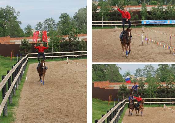 Выйдя с другого конца конюшни, мы остановились перед просторным стадионом. Его противоположная сторона была перекрыта только традиционным невысоким деревянным ограждением, а сразу за ним открывался чудесный вид на поля и Москву реку. На фоне всего этого великолепия, на стадионе уже выстроились в ожидании всадники. Сергей Владимирович представил каждого из них, и под аплодисменты представление началось.