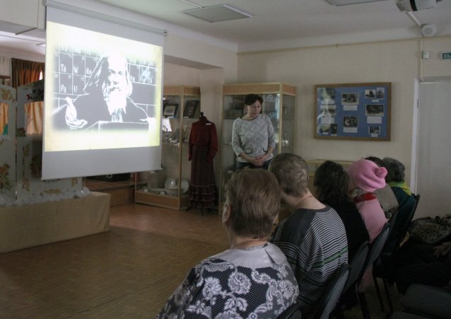Традиционно для посетителей Отделения дневного пребывания для пенсионеров и инвалидов г.Лыткарино (ГБУСО МО «Комплексный центр социального обслуживания и реабилитации «Люберецкий») Лыткаринский историко-краеведческий музей проводит экскурсии, лекции и мероприятия на интересные темы. 15 февраля состоялась очередная встреча, на этот раз она была посвящена 185-летию Д.И. Менделеева и 150-летию Периодической таблицы химических элементов. Среди гостей было немало химиков по образованию, поэтому тема мероприятия была им особенно интересна. Рассказ о жизни и деятельности великого русского ученого основан на материалах музея-архива Д.И. Менделеева, который находится в Санкт-Петербургском университете. Интересные подробности, факты, фотографии заинтересовали всех присутствующих.