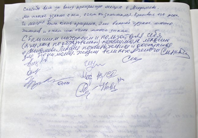 После лекции заведующая отделом «Планетарий» Марина Казанцева ответила на дополнительные вопросы, возникшие у аудитории. В книге отзывов посетители написали: «Спасибо вам за прекрасную лекцию о Менделееве. Мы многое узнали о нем, чем он занимался. Красивые дела его… У нас в группе много химиков и о нем мы знаем очень многое… С большим интересом и пользой для себя (я химик по образованию) прослушала лекцию о Менделееве. Лекция познавательная и доступная для понимания о жизни великого ученого».