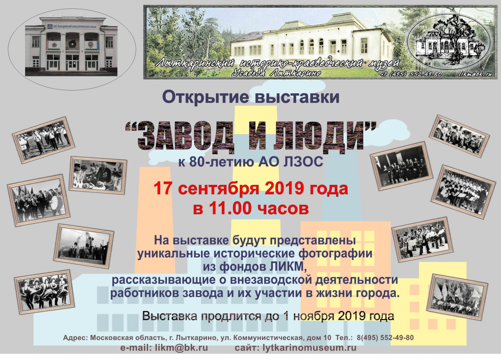 С 14 сентября по 1 ноября в Лыткаринском историко-краеведческом музее работает выставка «Завод и Люди», приуроченная к 80-летию Лыткаринского завода оптического стекла. На ней представлены уникальные исторические фотографии из фондов музея, рассказывающие об участии заводчан в жизни города Лыткарино. Культурные  и спортивные мероприятия, городские праздники и фестивали, начиная с 1945 года запечатлены на этих редких фотографиях. Первые драмкружок, волейбольная, футбольная, хоккейная команды, первый теннисный корт и городошная площадка, выступления заводских коллективов на центральном телевидении и лучших концертных площадках страны, массовые спортивные праздники на стадионе ЛЗОС и многое другое можно увидеть на этих старых снимках. Дополняют экспозицию интересные сувениры из оптического стекла, сделанные работниками завода — настоящими поэтами стекла! Особого внимания заслуживает коллекция стеклянных сувенирных медалей М.М. Любина, посвященных достопримечательностям, памятным и юбилейным датам страны.