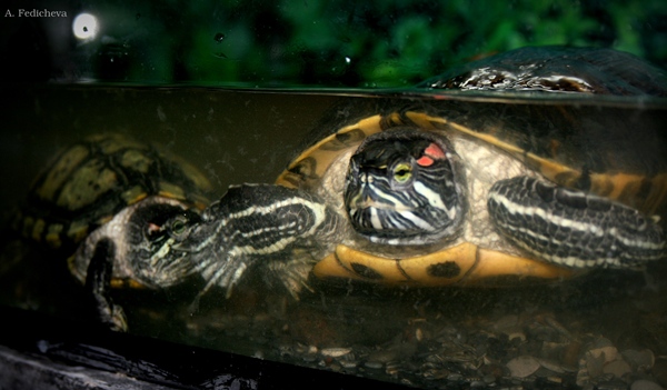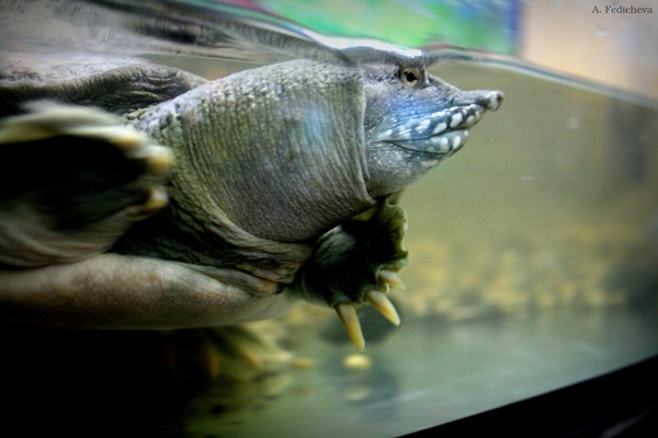 Особая гордость выставки — это ее живые обитатели — черепахи. Среди них и старейшее пресноводное — трионикс. Он существовал еще во времена динозавров. Правда, размером он был больше — диаметр около метра. Он интересен тем, что у него мягкотелый, хрящевинный панцирь. Трионикс подвижный и милый, но иногда бывает агрессивным.