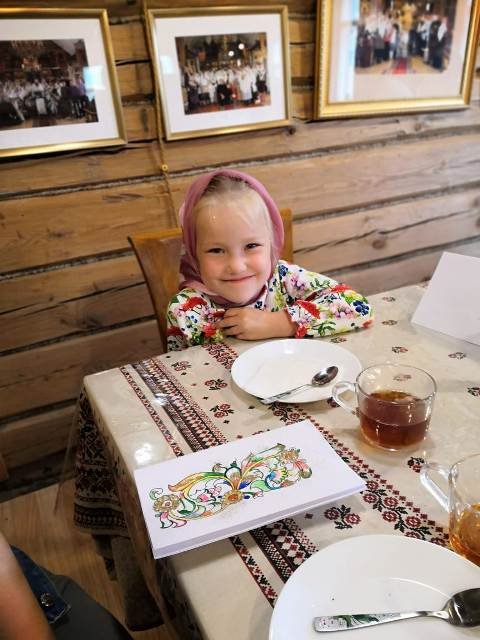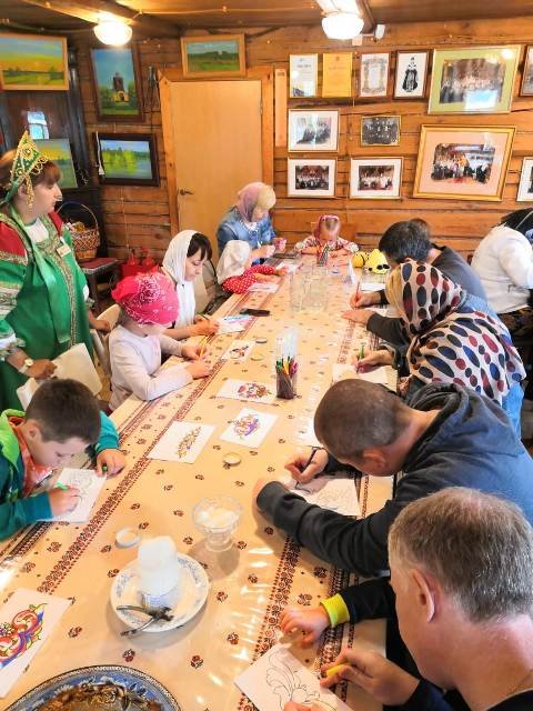 Вторая часть экскурсии проходила в трапезной. Мы разукрашивали узоры и золотили их! Это было очень увлекательно как для детей, так и для взрослых! Чай ароматный пили из настоящего самовара, который разожгли при нас! Ах, какие вкусные пироги подали нам к чаю! Грушевые, яблочные, вишневые, клубничные и ватрушечки! Угощали нас вареньем, медом и даже сахарок в прикуску ели, словно в 19 веке побывали! Всем рекомендую побывать в гостях у старообрядческой общины в Тураево, г. Лыткарино».