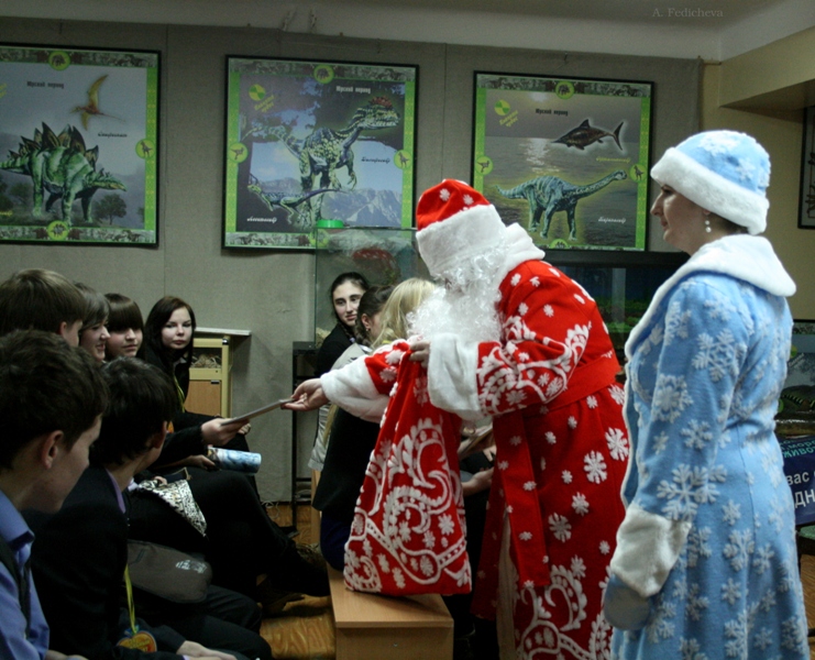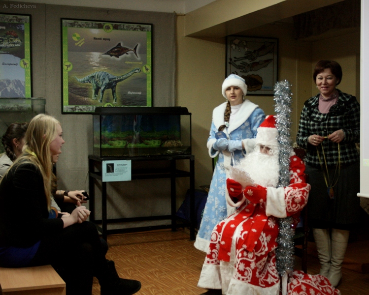 Ну и какой же праздник без сюрпризов. Поздравить гостей с наступающим Новым годом пришли Дед Мороз и Снегурочка. Они подготовили викторину про Арктику «А правда ли что…» и проверили знания учеников по этой теме. Наиболее активным ребятам были вручены призы. Оказалось, что без подарков не остался никто.