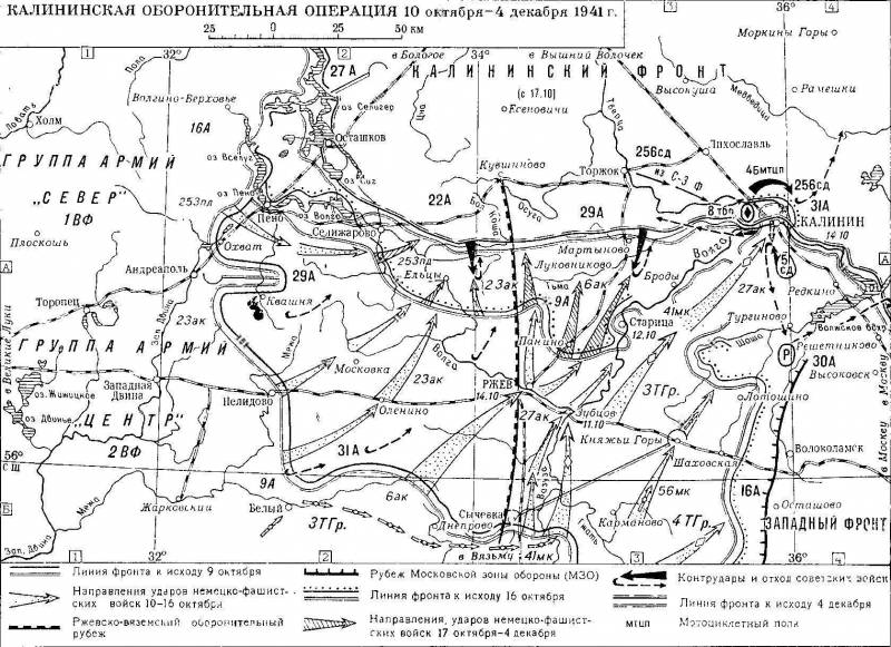 14 октября Советские войска оставили г. Калинин. Начались тяжелые оборонительные бои советских войск в Можайском укрепленном районе с подошедшим 40-м моторизованным корпусом противника, наступавшим на можайском направлении. Немецкие войска оккупировали г. Ржев. Жесточайшие рукопашные схватки развернулись у с. Бородино. Немцы заняли гг. Калинин (Тверь) и Ржев.