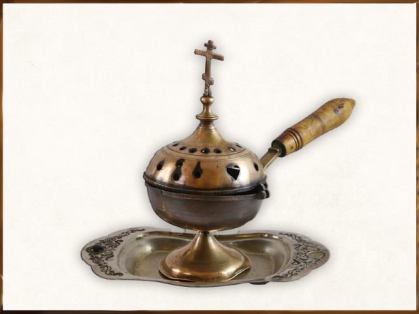 Кацея ручная с круглыми и сердцевидными отверстиями на крышке, откидной деревянной рукоятью. Состоит из двух латунных частей – крышки с восьмиконечным крестом на вершине и чаши на стояне (ножке) с круглым основанием, соединяющихся у рукояти с помощью металлического штыря.