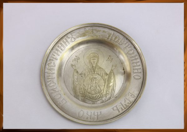 Небольшая тарель с гравировкой, выполненной штихелем. По краю блюда выгравировано: «Достойно есть яко воистину». В центре блюда изображен поясной образ Богородицы «Знамение», вписанный в круг. Руки сидящей Богоматери молитвенно подняты вверх (тип «Оранта» — лат.«молящаяся»), на груди находится сфера с Младенцем Христом. Спаситель изображен протягивающим персты правой руки, как вещающий присноживой глагол, а в левой руке имеющим книгу, которая ведает (содержит) божественные глаголы.