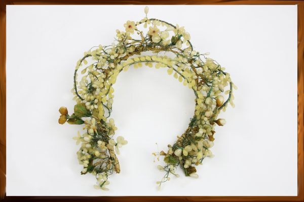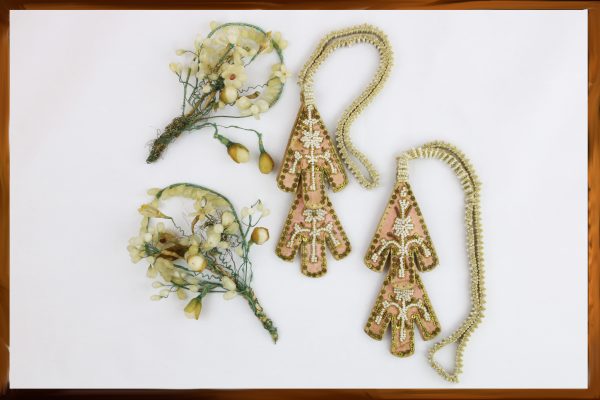 Украшения состоят из медной проволоки, обвитой цветной вощеной бумагой зеленого цвета. Восковой декор из капелек и лепестков тонированного выбеленного воска имитирует цветки, бутоны и листья. Две парные лестовки выполнены из бисера кремового цвета с использованием пайеток и канители.