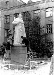 Место для памятника нашли быстро. По проекту перед фасадом школы должна была быть установлена скульптурная группа спортсменов, поэтому этот участок не был засажен деревьями и кустарником. Здесь, на самом видном месте, и решили установить народный памятник. В одной из мастерских Москвы на собранные народные средства была изготовлена скульптура воина-освободителя. Участники войны сами копали землю под фундамент, помогали устанавливать скульптуру солдата. На всех этапах создания памятника активное участие принимал Совет ветеранов.