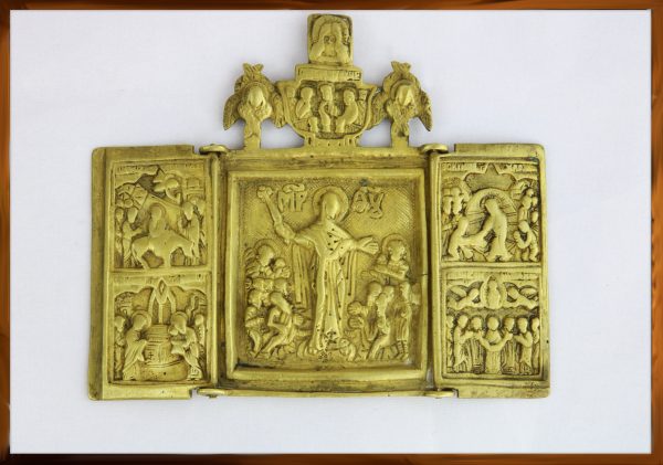 На центральной створе «Богоматерь всех скорбящих радость» – Богоматерь, обращенная вправо, с разведенными руками, в правой реке – жезл, по сторонам – болящие. В навершии центральной створы – «Нерукотворенный образ» и «Троица ветхозаветная», по бокам расположены два шестикрылых херувима. На левой створке: «Вход Господень в Иерусалим» и «Сретение Господне». На правой: «Воскресение Христово» и «Вознесение Господне». С обратной стороны иконы имеется петля-проушина.