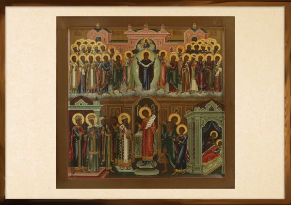 Композиция Покрова бывает разной. Единственным обязательным элементом в иконографии является изображение Богородицы. Особенностью этой иконы является то, что Богородица показана в молении Вседержителю, изображенному над ней в центре иконы. Рядом с Девой Марией — сонм святых, которые также молятся о спасении города. На иконе из собрания Тураевской общины Дева Мария изображена дважды: в центре композиции на облаке со свитком в руках и в нижнем правом углу, в сцене явления Роману Сладкопевцу. В нижней части иконы изображены Лев Х, Андрей Юродивый и его ученик Епифаний. Интересно, что в центре нижней части изображен Роман Сладкопевец (490—556) — святой, живший задолго до событий Покрова. Он был настоятелем той самой Влахернской церкви, где молились о спасении Константинополя Лев Х и его подданные. И именно Роман Сладкопевец написал молитву, которую читали в ту ночь византийцы. В правом нижнем углу — видение Богородицы Роману Сладкопевцу.