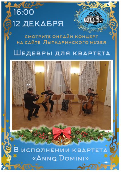 Мы рады поделиться с Вами радостной новостью! В усадебной гостиной возобновляется концертная деятельность. В преддверии новогодних праздников предлагаем погрузиться в мир волшебной русской классической музыки, которую Вам подарит квартет «Anno Domini»: Михаил Акинфин – скрипка, Дмитрий Акинфин – скрипка, Александра Желвакова – альт, Екатерина Модина – виолончель.
