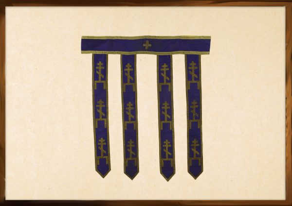 Пояс сшит из фиолетового муара с вытканным золотными нитями объемным крестом посередине, подкладка из современной х/б ткани желтого цвета. К поясу пришиты источники в виде четырех длинных лент из фиолетового муара с пришитыми из золотистого галуна изображениями Голгофских крестов на подножии. Подкладка источников современная из х/б ткани желтого цвета. По краям пояса и источников пришит золотистый галун.