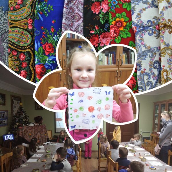 Воспитанники младшей группы детского сада «Колобок» посетили занятие, посвященное искусству ручной набойки ткани и узнали историю самого популярного женского головного убора в России — цветного платка. Платок на Руси появился в далеком XII в., а называли его тогда совсем непонятным словом для современного человека – «убрусом». Только спустя шесть столетий стали появляться первые набивные платки с различными рисунками. Приложит мастер доску на ткань в нужном месте, да еще постучит, побьет, чтобы краска на ткани с печатной доски лучше отпечаталась. И вот уже радуется глаз цветочной поляне: маковой, ромашковой, васильковой. И цвета все яркие, сочные. Вот так и возникло название «набойка», «набивная ткань». Ручная набойка — один из старинных способов художественного оформления тканей, рисунок печатался при помощи деревянных набивных досок с вырезанным на них орнаментом. Посетители практического занятия познакомились с ремёслами и традициями, историей набойной техники, основными принципами построения орнамента и композиции. Теоретическая часть перешла в практическую, на которой  ребята научились печатать красками на ткани и забрали с собой памятные сувениры.