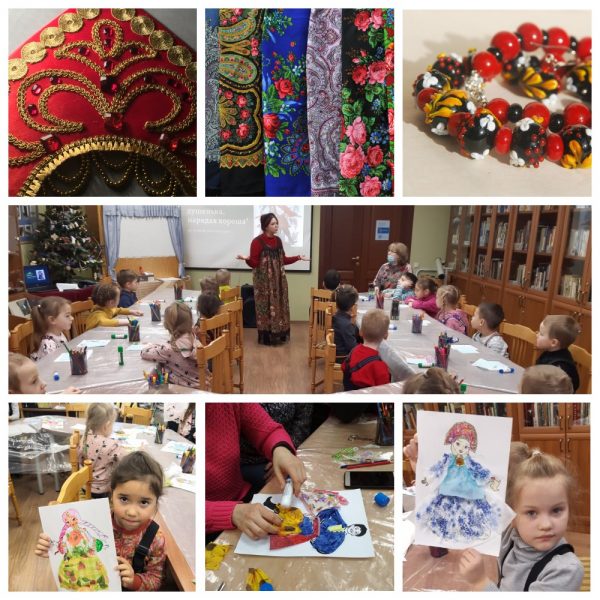 Традиционный костюм – важная часть духовной культуры народа. Русская народная одежда отличается высокой художественностью и разнообразием, сохраняет вековые традиции. Мероприятие «Во всех ты, душенька, нарядах хороша» посетили воспитанники старшей группы детского сада «Дельфинчик». В ходе музейного занятия ребятам рассказали основные типы мужского и женского костюма, особенности художественного решения их украшений и дополнений. Маленьким детям постоянно хочется творить и создавать что-то новое. Любое рукоделие способствует развитию ребенка, улучшает координацию и развивает моторику, поэтому после лекционной части наступила очередь практического занятия. Мастер-класс по моделированию элементов русской праздничной одежды из цветных салфеток и бумаги прошел очень задорно и весело.  Аппликации из цветной бумаги – давно уже ставшее традиционным творческое занятие для детей. Повторив простые действия за экскурсоводом, каждый ребенок создал аппликацию по мотивам народно костюма из цветной бумаги своими руками. Все работы получились очень яркими и объемными, чем порадовали своих маленьких владельцев.