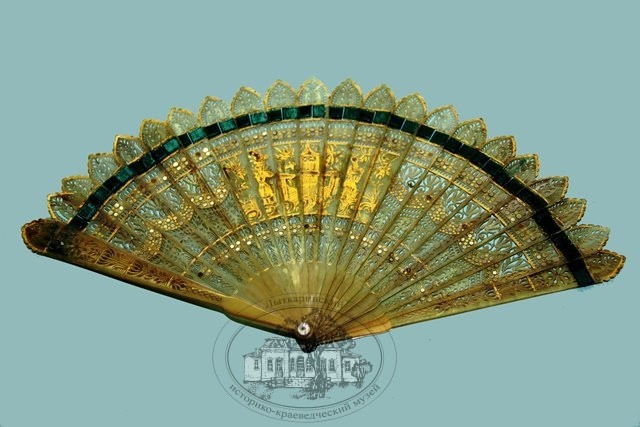 Веер XIX века, изготовленный в Западной Европе, состоит из 22 резных пластин из панциря черепахи бежево-коричневого цвета. Пластины в нижней части скреплены штырьком из белого металла, а по верхнему краю – бархатной темно-зеленой тесьмой. В развернутом виде в центре видна позолоченная картинка – карета с грумом (слугой, верхом сопровождающий всадника или едущий на козлах, на задке экипажа) и кучером.