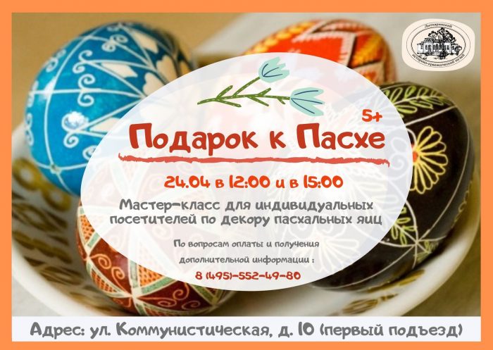 Приглашаем индивидуальных посетителей на пасхальный мастер-класс по росписи яиц воском. Индивидуальное занятие для всех желающих состоится 24 апреля (суббота) в 12:00 и 15:00 по адресу: г.Лыткарино, ул.Коммунистическая, д.10 (первый подъезд). Справки и запись по тел. 8 (495) 552-49-80