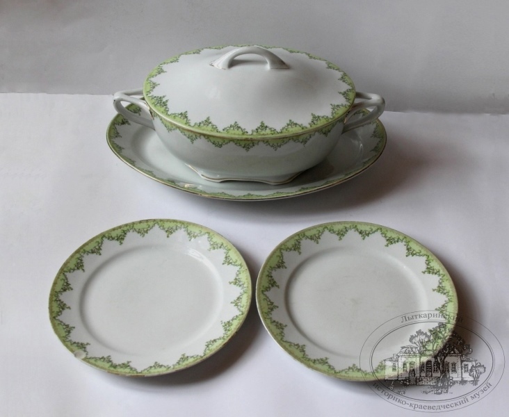 Недавно потомками рода Пантюшиных, живших в с. Верхнее Мячково, в музей были переданы предметы столового сервиза: супница с крышкой, блюдо и 2 тарелки. Весь набор расписан цветочными гирляндами в зеленых тонах со стрельчатой золотистой каймой и принадлежит производству «Товарищества М.С. Кузнецова».