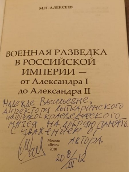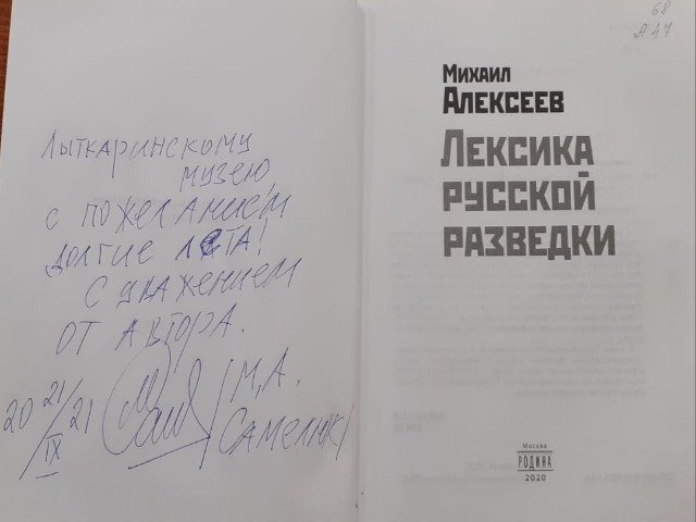 Благодарим нашего доброго друга и коллегу за внимание к нашему общему делу и преподнесенные в дар Лыткаринскому историко-краеведческому музею книги по истории военной разведки — одной из замечательных, непростых и одновременно романтичных служб, стоящих на защите безопасности нашей родины.