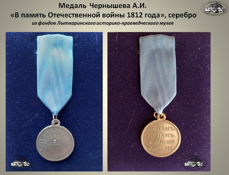 В Лыткаринском историко-краеведческом музее  экспонируются  награды А.И. Чернышева. Среди них — медаль «В память Отечественной  войны   1812 года».
