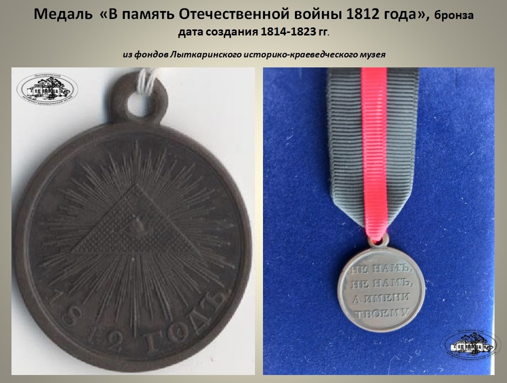 Приказом от 5 февраля 1813 г. император Александр I учредил серебряную медаль  «В память Отечественной войны 1812 года», которой «..награждались все строевые чины армии и ополчения, принимавшие участие в военных действиях с французами до конца 1812 года, то есть в пределах Отечества. Это был первый случай в истории русской наградной системы, когда совершенно одинаковую медаль получали участники войны без учета их чинов, сословного положения  и степени личных заслуг».Для всех «непременным условием получения этого знака отличия являлось личное участие в боевых действиях с наполеоновской армией на территории России».1,2В Приказе говорилось: «Воины! В ознаменование …незабвенных подвигов ваших, повелели мы выбить и освятить сребряную медаль, которая с начертанием на ней прошедшего столь достопамятного 1812 года долженствует на голубой ленте украшать неопредолимый щит Отечества –грудь вашу»3.