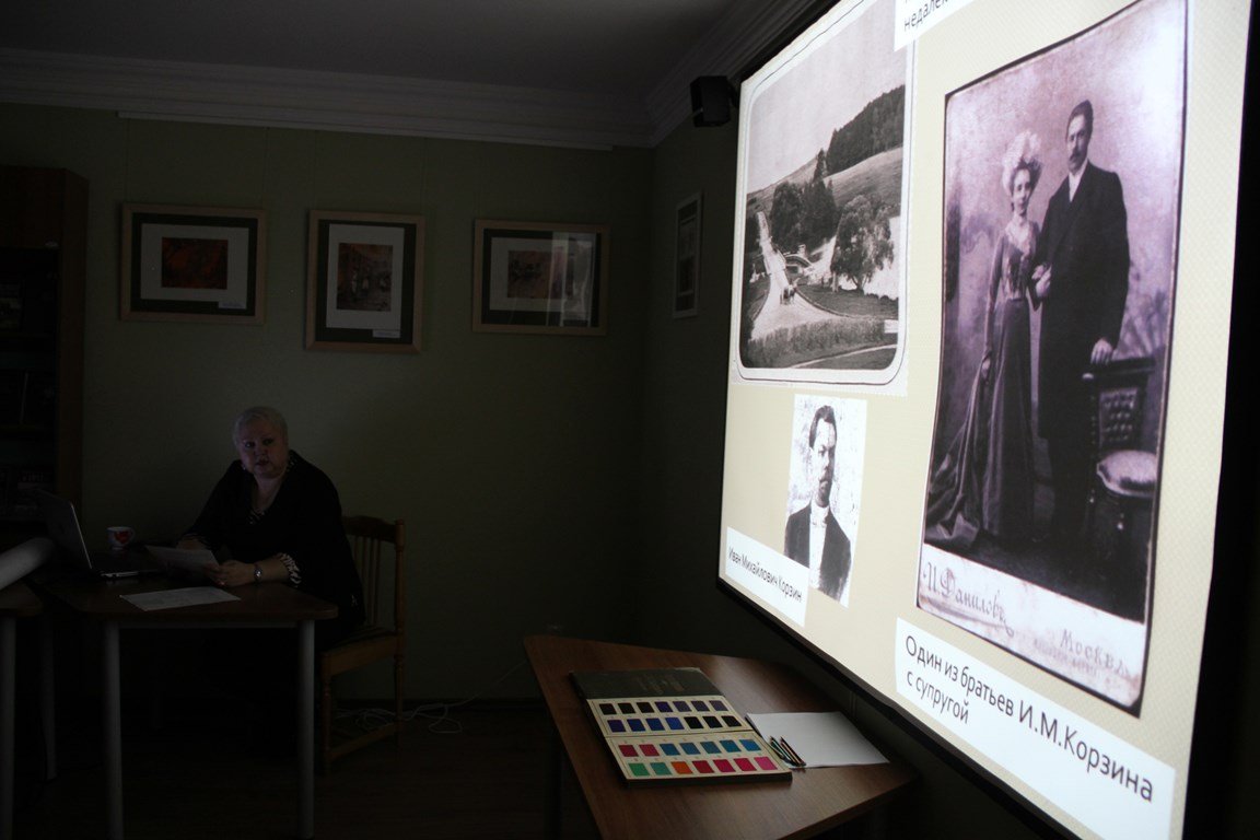 Презентацию, посвященную семье Корзиных, представила собравшимся директор Лыткаринского историко-краеведческого музея Надежда Васильевна Голубева. Представители семьи Корзиных – одни из первых лыткаринских предпринимателей, которые в конце XIX века смогли получить купеческое и промысловое свидетельство, они организовали собственную торговлю по продаже шерстяных тканых изделий на местных ярмарках и в Москве. В начале ХХ века ими была основана Пехорская текстильная фабрика, которая действует и в настоящее время недалеко от деревни Жилино.