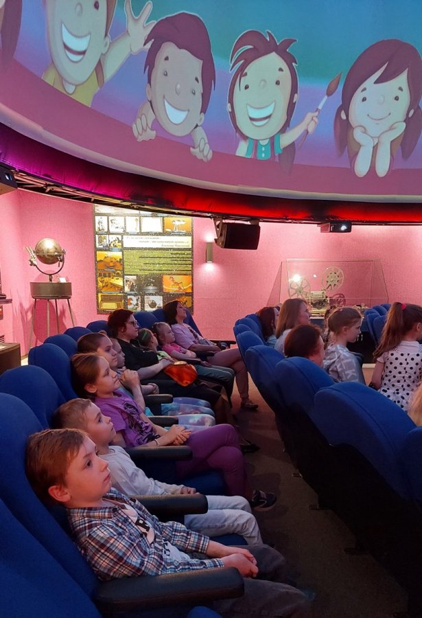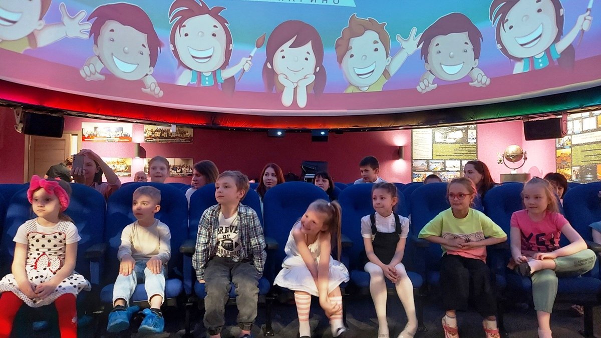 Далее гости посмотрели красочный и познавательный фильм «Земля глазами Гагарина». Вместе с первым космонавтом планеты ребята облетели Землю и увидели ее красивейшие места из кабины космического корабля. Один виток длиною в 108 минут проходил в ночное время над западным полушарием, а днем – над восточным, где находится наша страна. Ребята имели возможность полюбоваться ее просторами и оценить размеры по отношению к планете Земля. Фильм доставил детям не только эстетическое удовольствие, но и рассказал о трудностях полета Юрия Алексеевича Гагарина. Они услышали голос первого космонавта во время его переговоров с Центром управления полетами, прочувствовали напряженность происходящих событий и смогли оценить самообладание первого космонавта планеты.