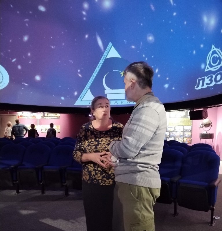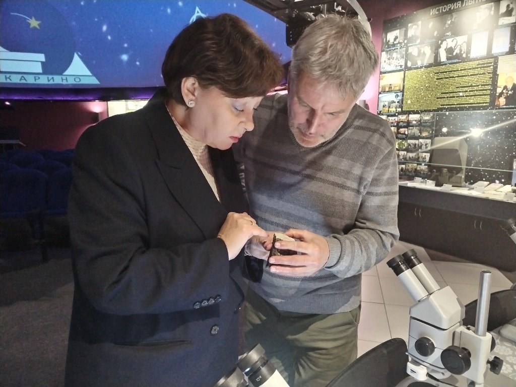 Тимур привез в подарок Лыткаринскому планетарию для проведения мастер-классов по микроскопии шлифы пяти каменных метеоритов, найденных в разных местах Земли. Гости планетария также имели возможность подержать в руках прилетевший на Землю осколок астероида Веста.