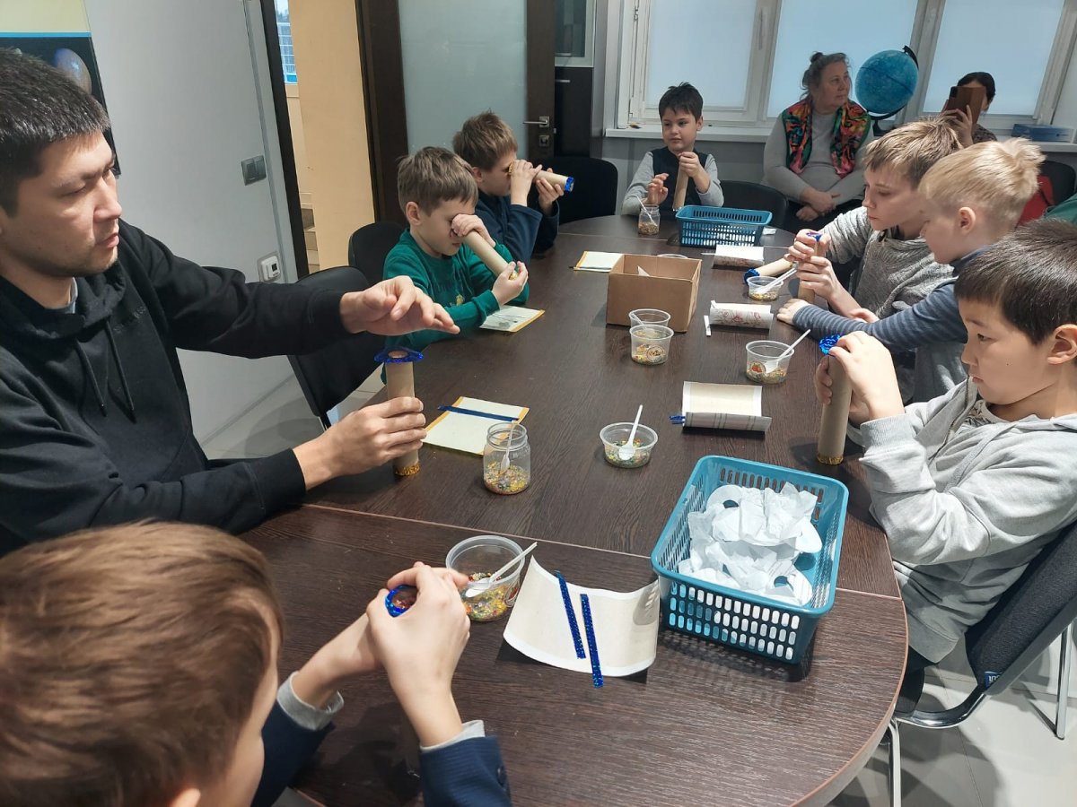 Затем ребята в учебном классе детской обсерватории занялись техническим творчеством и самостоятельно изготовили калейдоскопы с использованием цветного оптического стекла. Они познакомились с волшебными свойствами зеркальной призмы, которая и является главным секретом этой оптической игрушки.