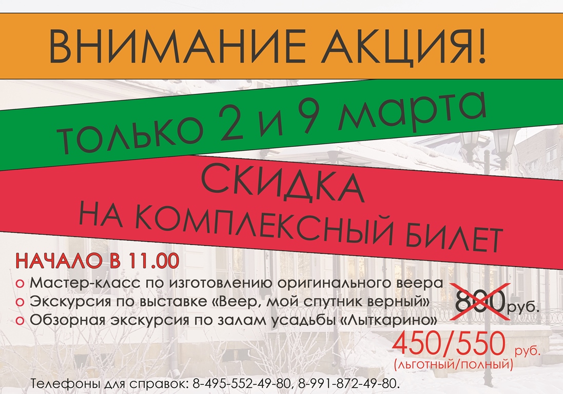 Только 2 и 9 марта Лыткаринский историко-краеведческий музей предлагает посетителям скидку на комплексный билет. В стоимость входят: экскурсия по выставке «Веер, мой спутник верный», мастер-класс по изготовлению оригинального дамского аксессуара – веера-кокарды и обзорная экскурсия по залам усадьбы. Цена – 450/550 рублей.