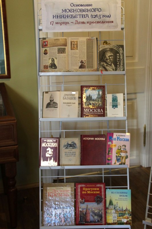 С историей Московского княжества можно ознакомиться по книгам из фонда музея, составившим выставку. Всего на стенде представлено 12 книг, из них 4 – детские, которые доступным языком рассказывают об истории Москвы и древнего Кремля. На полках можно увидеть энциклопедические издания об истории Москвы, подарочное издание Михаила Вострышева «Москва первопрестольная» 2016 года издания, исторический роман Дмитрия Балашова «Младший сын», в котором рассказывается о борьбе за власть старших сыновей А. Невского и о создании княжества Московского как центра, объединяющего страну, его младшим сыном Даниилом. Книга барона Сигизмунда Герберштейна (1486-1566) «Московия» «привела своего автора к всеевропейской славе, так как стала, по меньшей мере на два столетия, самой лучшей, самой полной, самой, как считалось, достоверной работой о великой стране Руссии и ее народе». Книга переиздана в 2007 году в Москве издательством АСТ-Астрель.