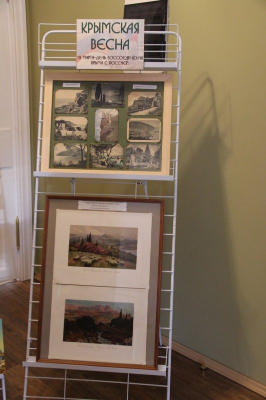 На художественной выставке, посвященной Крыму, представлено два стенда. На первом можно увидеть комплект редких открыток с видами Крыма 1930-х годов из альбома, который передала в музей жительница города О.В. Калинина. Альбом наполнен редкими открытками по искусству: репродукциями картин музея изящных искусств Александра III (будущего Русского музея), Третьяковской галереи, много фотооткрыток различных городов и курортов страны: Казани, Ленинграда, Ашхабада, Кисловодска, Москвы, изданных с конца 1920-х по 1950-е годы.