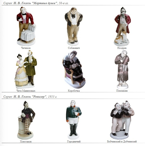 В 1950-е годы в серии «Гоголевские персонажи» были выпущены девять статуэток. Шесть фарфоровых статуэток вышли в серии «Н.В.Гоголь «Мертвые души»»: «Маниловы», «Чичиков», «Собакевич», «Коробочка», «Плюшкин», «Ноздрев» и в серии  «Н. В. Гоголь «Ревизор»» вышли три статуэтки: «Хлестаков», «Бобчинский и Добчинский», «Городничий».