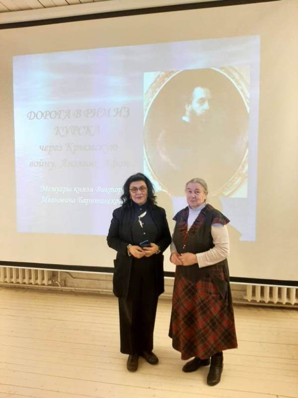 На презентации В.П. Олейникова рассказала о работе над книгой и о своих встречах с членами семьи Барятинских, эмигрировавшими в Европу. Книга проиллюстрирована фотографиями, гравюрами и копиями картин из музейных и частных коллекций.