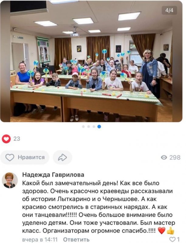 В Лыткаринском историко-краеведческом музее 18 мая состоялась традиционная акция «Ночь музеев». В России она впервые прошла в 2002 году. Цель акции – сохранение культурных ценностей. Городской музей присоединился к этой культурной акции в 2011 году. С тех пор каждый год разрабатывается новая программа праздника. Тема Ночи музеев по всей России в 2024 году – «Из поколения в поколение. Семейные реликвии». Тема акции в Лыткаринском историко-краеведческом музее в этом году – «Лыткарино – 595 лет. Деревня. Поселок. Город», также раскрывающая тему преемственности поколений. В этом году исполняется 595 лет с даты первого письменного упоминания Лыткарино в старинной грамоте.