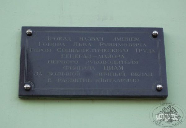 Лев Рувимович Гонор — Почетный житель г.Лыткарино, генерал-майор, участник обороны Сталинграда в годы Великой Отечественной войны, имел награду «За оборону Сталинграда», Герой социалистического труда, дважды лауреат Государственной премии, кавалер многих орденов, в том числе трех орденов Ленина, ордена Кутузова 1-ой степени, первый директор Научно-испытательного центра Центрального института авиационного моторостроения им. П.И. Баранова (НИЦ ЦИАМ). Он внес большой вклад в развитие города Лыткарино. В трудные послевоенные годы под его чутким руководством был построен в Лыткарино Дворец культуры «Мир», который до сих пор остается одним из самых лучших в Подмосковье, введены в строй многие жилые дома и детские сады. Похоронен на Новодевичьем кладбище, неподалеку от могил Н.С. Хрущева и Марка Бернеса.