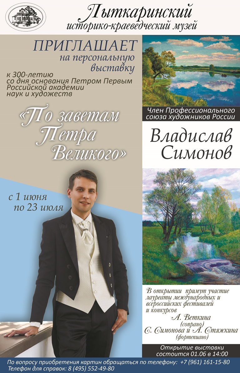 Лыткаринский историко-краеведческий музей приглашает любителей живописного искусства на открытие новой художественной выставки. Автор работ – Владислав Симонов. Выставка «По заветам Петра Великого» посвящена 300-летию со дня основания Петром Первым Российской академии наук и художеств. Открытие состоится 1 июня в 14 часов. Вход свободный. Выставка будет работать до 23 июля. Посетить ее можно в часы работы музея.