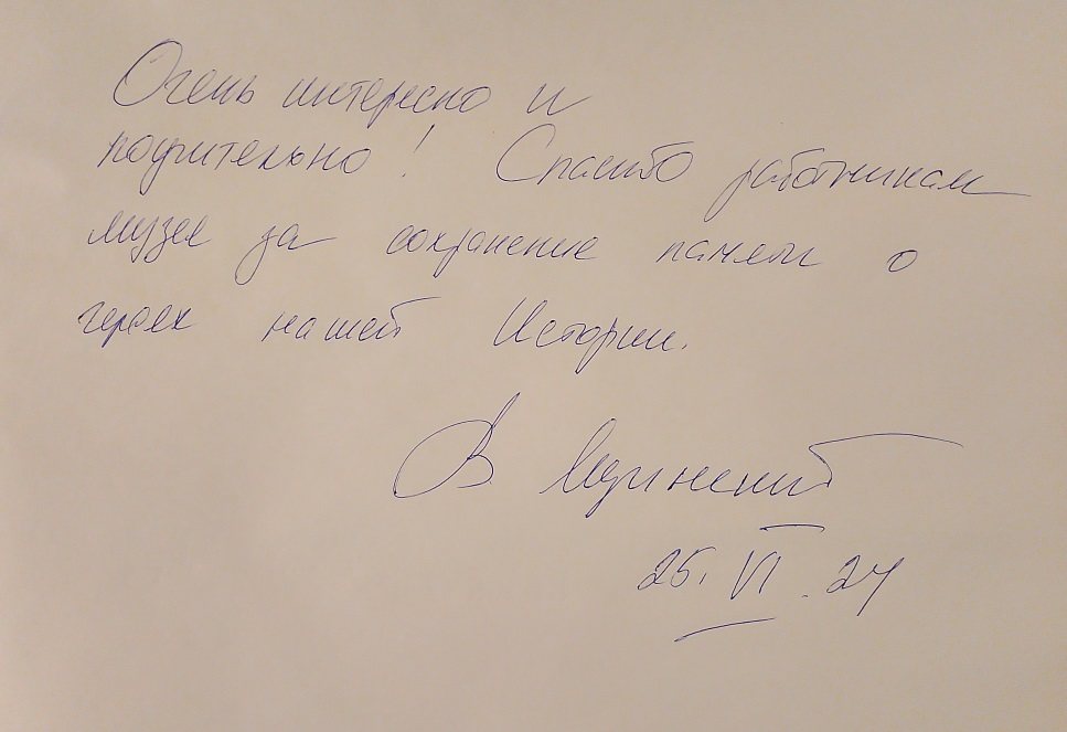 В книге отзывов почетный гость оставил отзыв: «Очень интересно и поучительно! Спасибо работникам музея за сохранение памяти о героях нашей Истории».