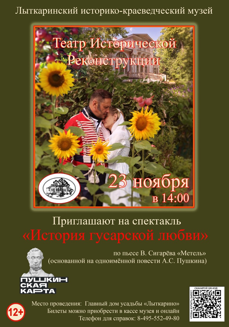 Приглашаем на спектакль-реконструкцию, действие которого развернется в аутентичной обстановке дворянской усадьбы! У вас есть возможность перенестись на 200 лет назад, в пушкинскую эпоху, увидеть сцены из жизни русской аристократии, практически присутствовать у них в гостях, а также сопереживать перипетиям судеб героев пьесы.
