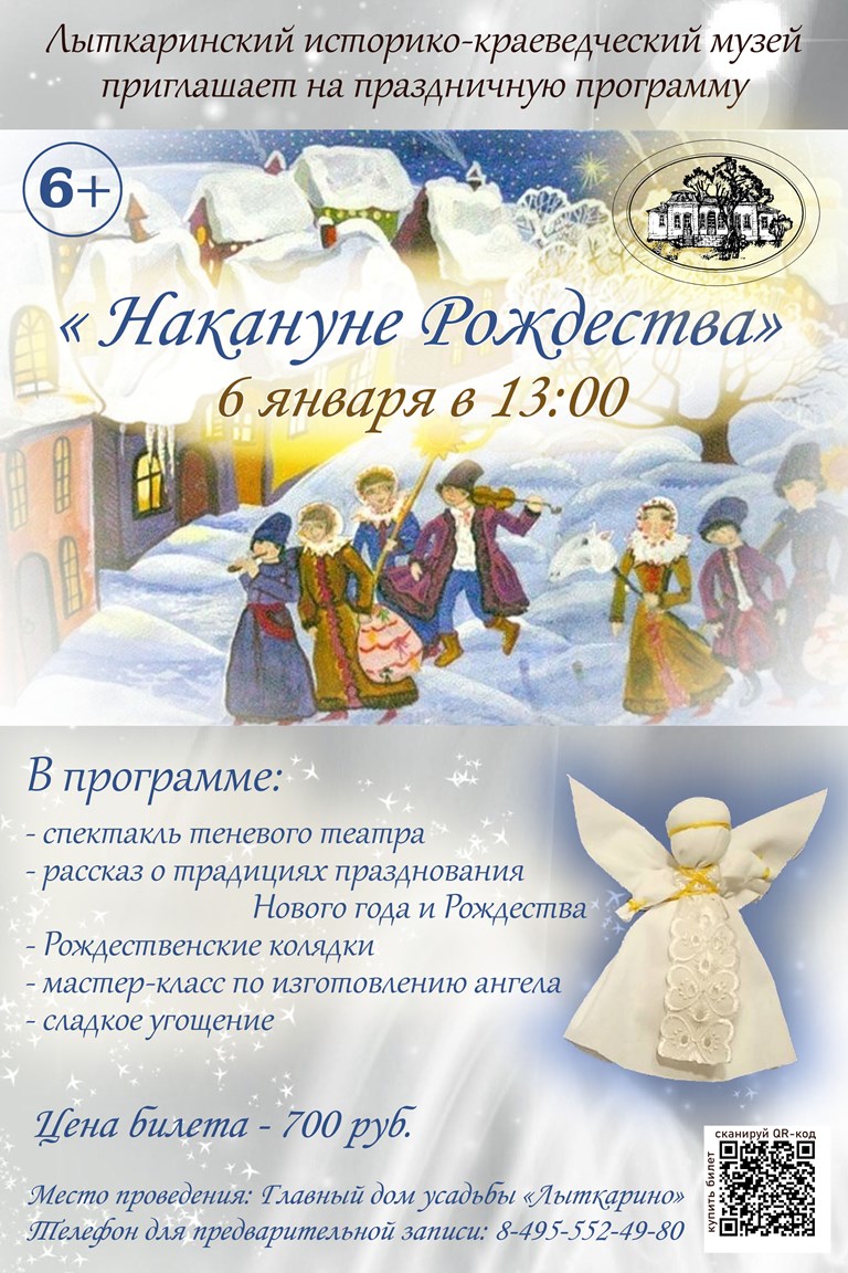 Лыткаринский историко-краеведческий музей приглашает вас на праздничную театрализованную программу, посвященную Рождеству! Вы узнаете о традициях празднования Нового года и Рождества, увидите спектакль теневого театра, сможете принять участие в старинном обряде колядования, на мастер-классе изготовите рождественского ангела из ткани, который станет вашим оберегом на весь год. А также гостей праздника ждет сладкое угощение!