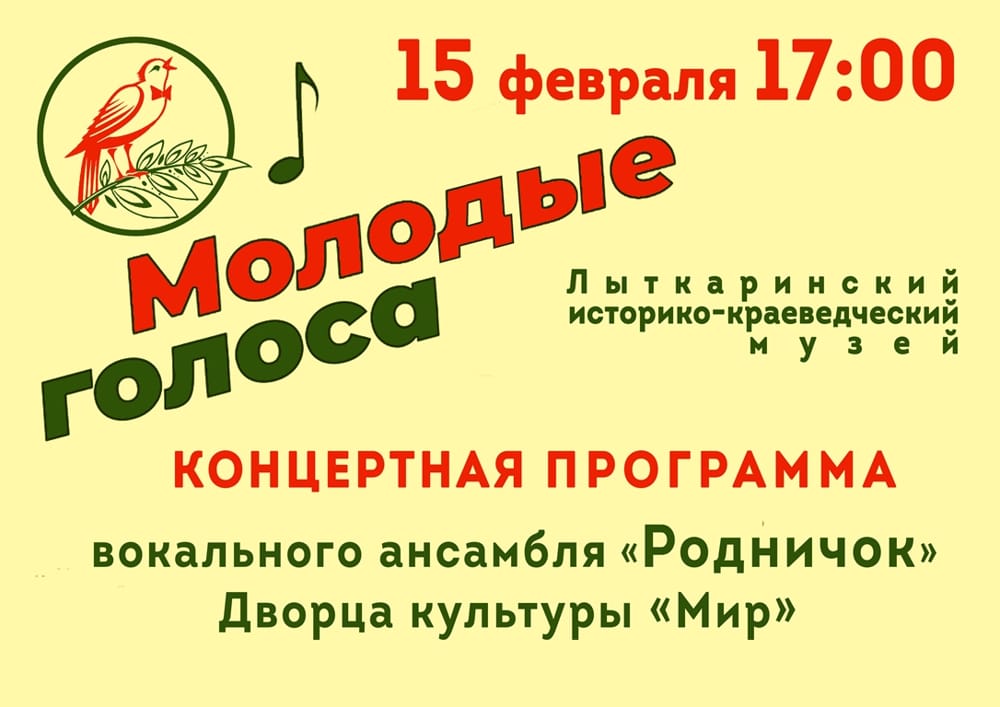 Уважаемые лыткаринцы! Лыткаринский историко-краеведческий музей приглашает вас 15 февраля в 17:00 на концертную программу «Молодые голоса», в которой примут участие солисты вокального ансамбля «Родничок». Это коллектив-спутник оперного театра «Родник» ДК «Мир». Руководит творческими коллективами заслуженный педагог Людмила Васильевна Олешкевич. Солисты  ансамбля «Родничок» – это учащиеся и выпускники детской музыкальной школы г. Люберцы. Они постоянные участники концертных программ и оперных спектаклей. В программе концерта прозвучат произведения духовной и патриотической тематики, популярные песни. Вход свободный. Справки по телефону: 8 (495) 552-49-80.